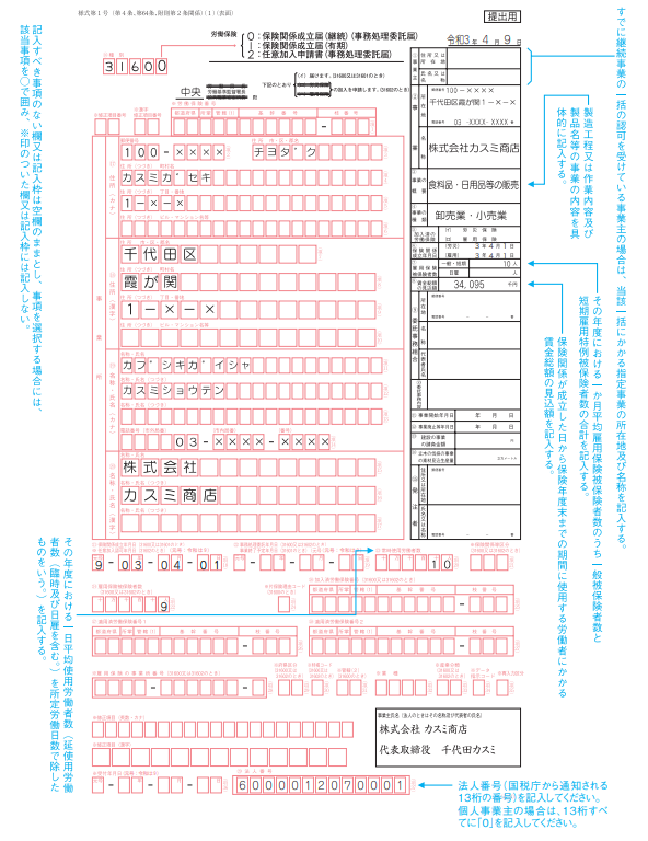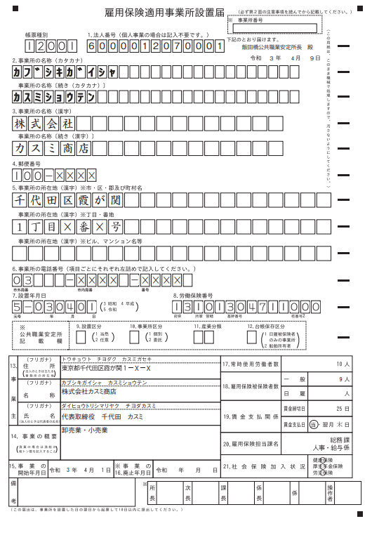 雇用保険適用事業所設置届には御社の情報の他、上記の保険関係設立届を提出した際に振り出された番号等を記入します。