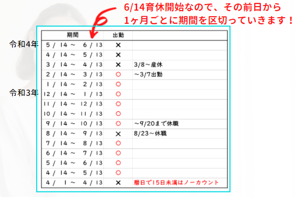 この「雇用保険に加入している期間」は、この「育児休業開始日」の前日から1か月ごとに区切った期間のうち、雇用保険に加入し、賃金の支払いの基礎となった期間が11日以上ある日を1か月として判断します。