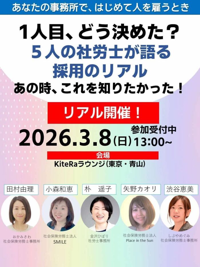 事務所からのお知らせ 社労士向けセミナー開催のお知らせ 2026年1月3日 2026年3月8日(日) 東京・青山にてセミナーを開催いたします! 「はじめてスタッフを雇う」をテーマに、5人の女性社労士が本音でお話しいたします。 社労士事務所の成長において、「はじめてスタッフを雇う」という決断は、事務所の生産性とサービスの幅を広げる大きなチャンスでもある一方で、業務品質の維持、顧客対応、労務リスク...